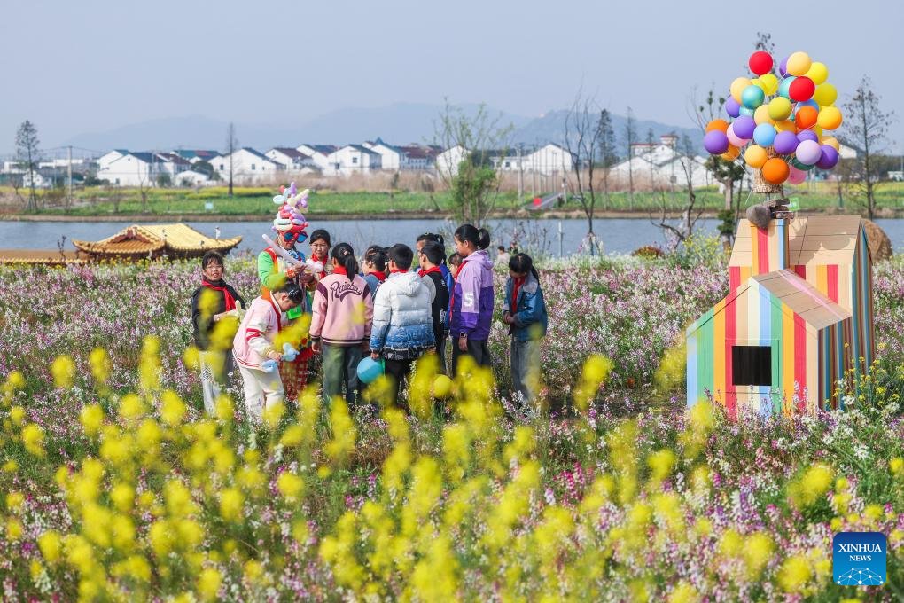 Children play amid blooming flowers in Jianhu Lake wetland nature reserve in Yuecheng District of Shaoxing, east China's Zhejiang Province, March 27, 2024. (Xinhua/Xu Yu)