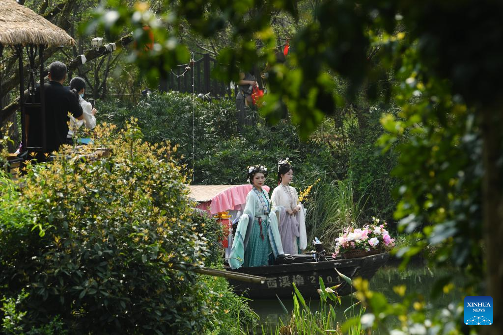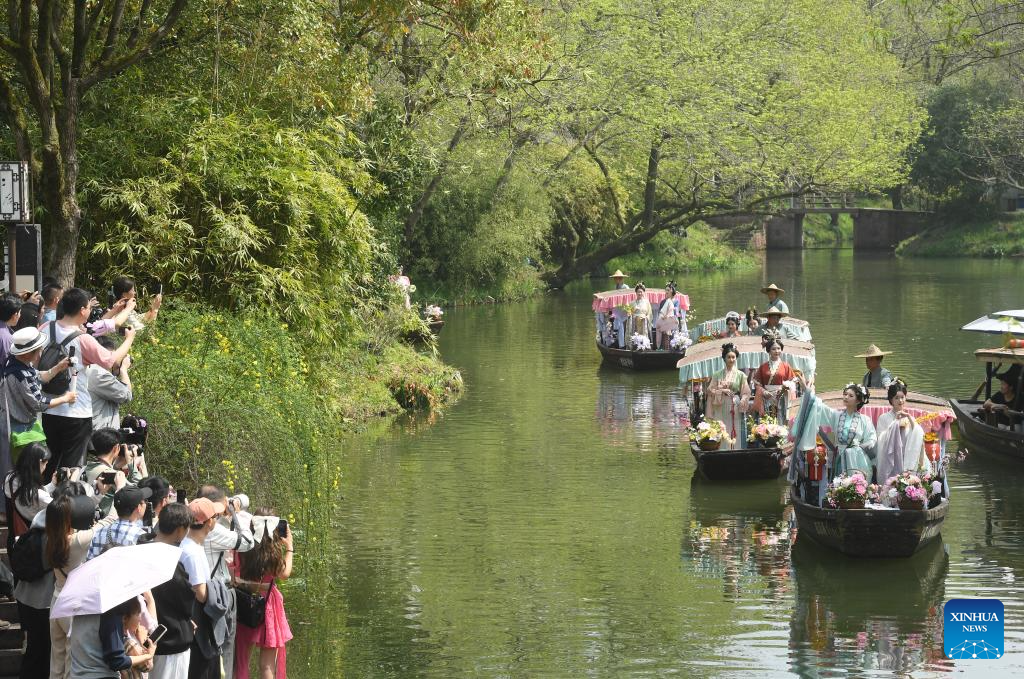 Performers in traditional costumes take a boat parade during the Huazhao Festival celebrations in Xixi Wetland in Hangzhou, east China's Zhejiang Province, March 24, 2024. (Xinhua/Weng Xinyang)