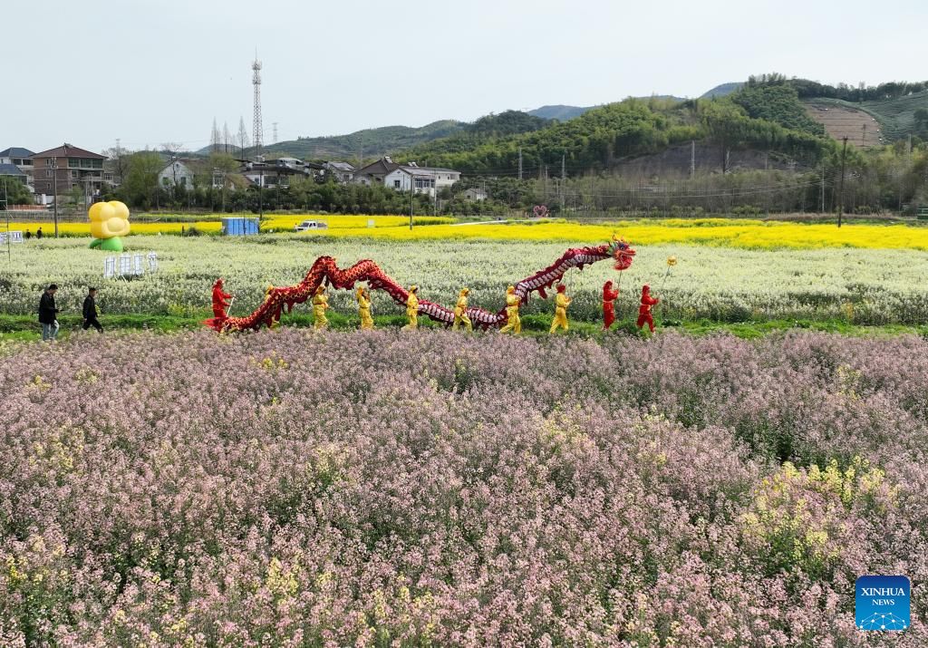 Dragon dance performers walk amid blooming cole flowers in Daixi Town of Wuxing District in Huzhou, east China's Zhejiang Province, March 30, 2024. (Xinhua/Weng Xinyang)