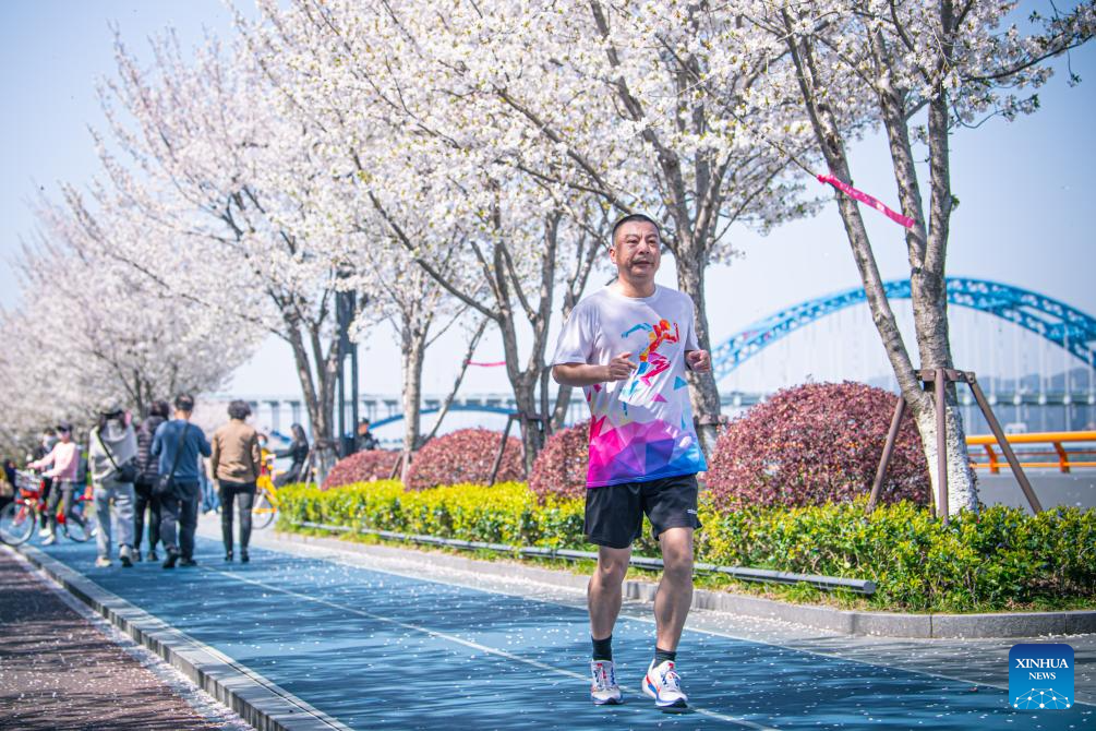 A citizen runs on a greenway for exercise in Binjiang District in Hangzhou, east China's Zhejiang Province, March 29, 2024. (Xinhua/Jiang Han)