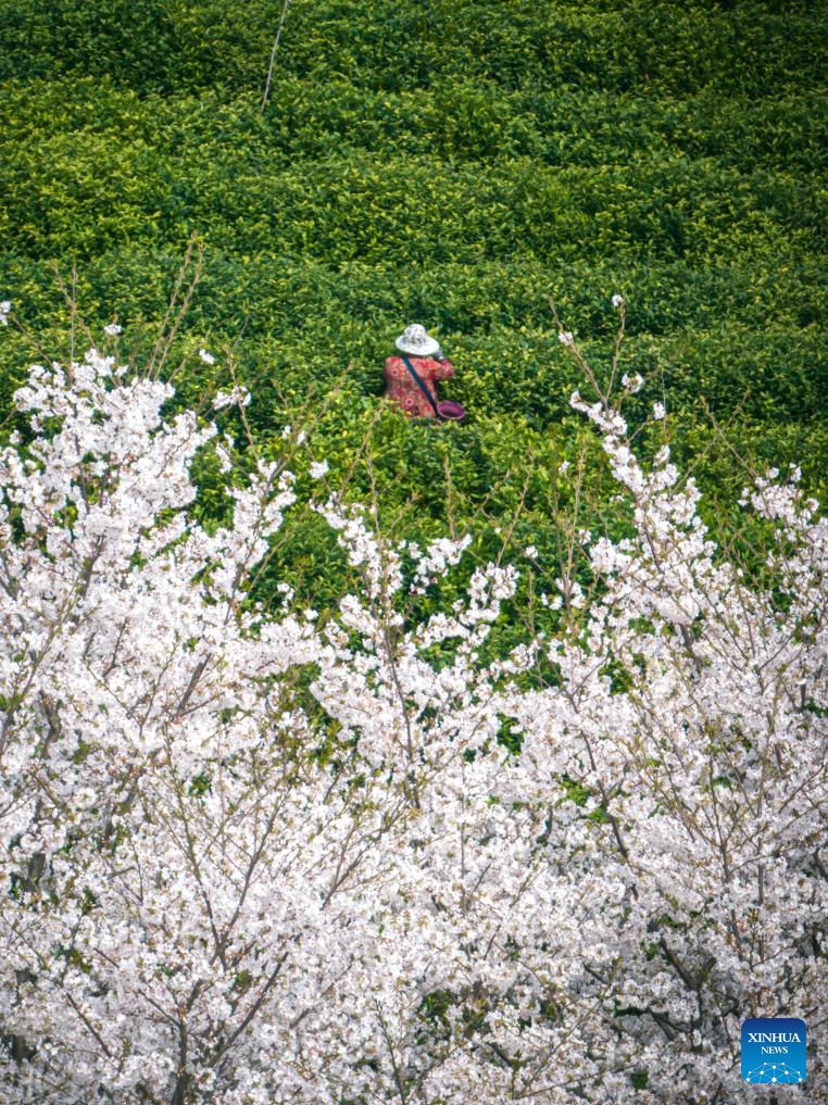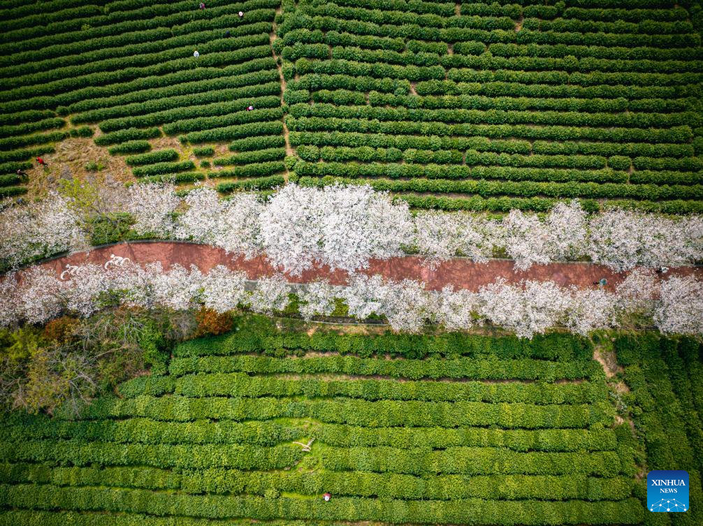 An aerial drone photo taken on March 27, 2024 shows a view of cherry blossoms and tea gardens on Gaoting Mountain in Shangcheng District of Hangzhou, east China's Zhejiang Province. (Xinhua/Jiang Han)