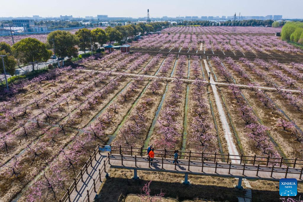 An aerial drone photo taken on March 29, 2024 shows peach blossoms in Beihe Village of Yaozhuang Town in Jiashan County of Jiaxing, east China's Zhejiang Province. (Xinhua/Xu Yu)