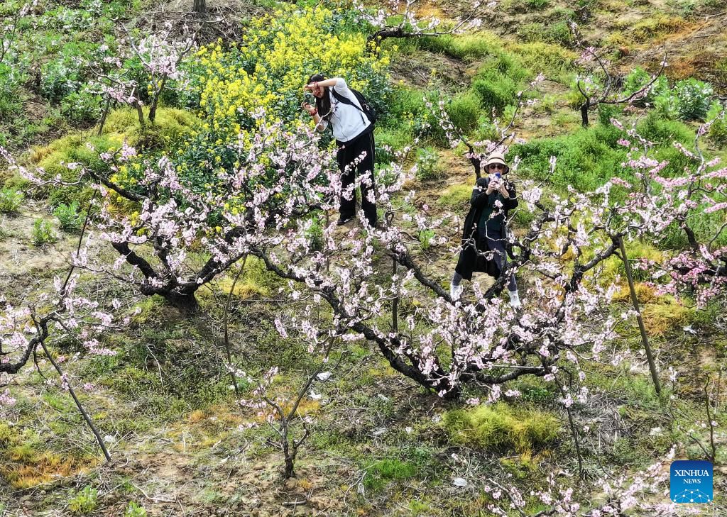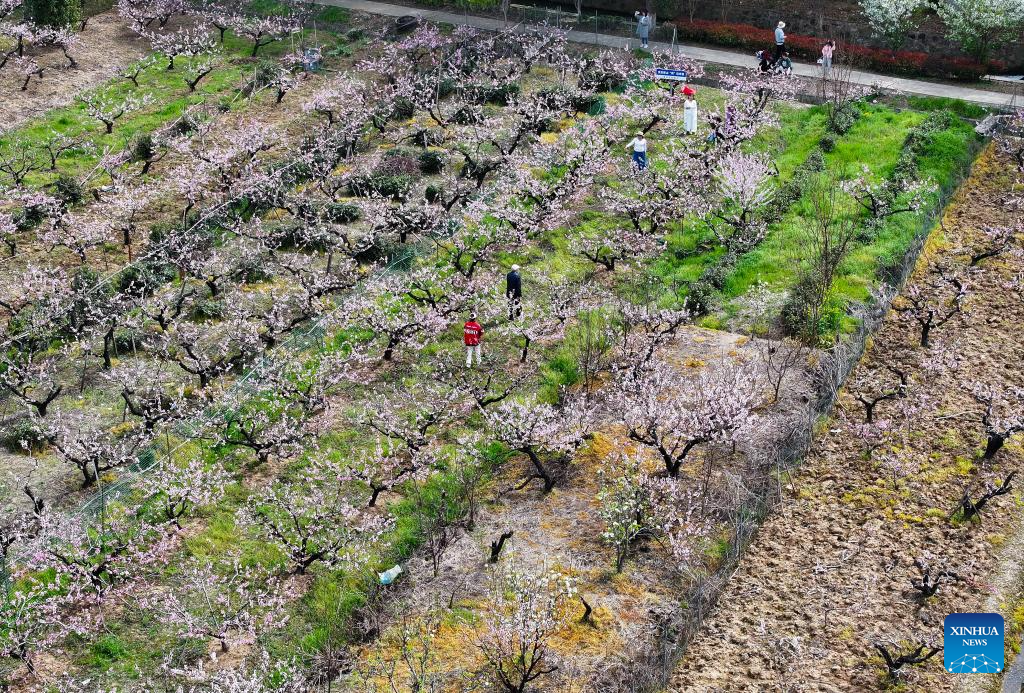 An aerial drone photo taken on March 30, 2024 shows tourists taking photos of peach blossoms in Zhangshan Village of Zhenjiang City, east China's Jiangsu Province. (Xinhua/Ji Chunpeng)