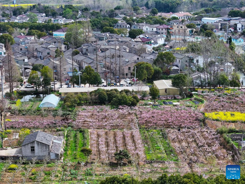 An aerial drone photo taken on March 30, 2024 shows scenery of peach blossoms in Zhangshan Village of Zhenjiang City, east China's Jiangsu Province. (Xinhua/Ji Chunpeng)