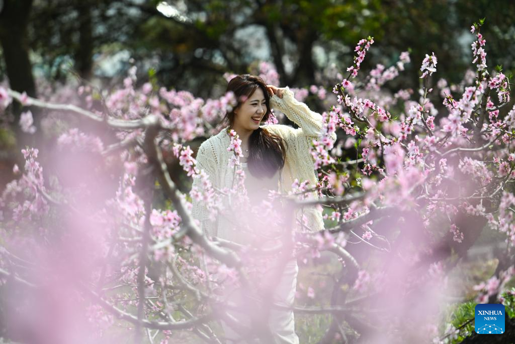 A tourist is pictured amid peach blossoms in Zhangshan Village of Zhenjiang City, east China's Jiangsu Province, March 30, 2024. (Xinhua/Ji Chunpeng)