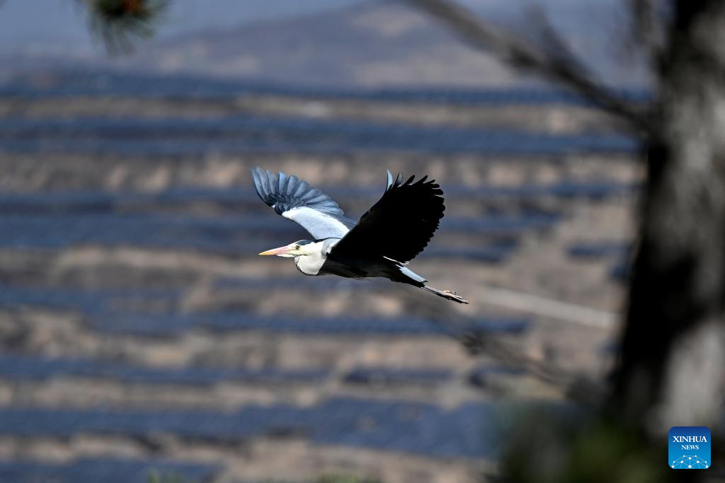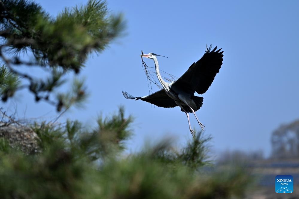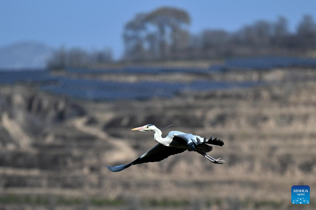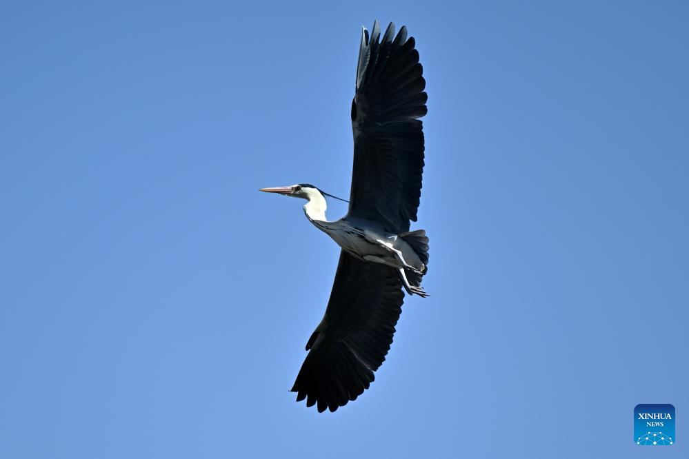 A heron flies in the sky in Jicui Town of Fangshan County, Lyuliang City, north China's Shanxi Province, March 29, 2024. A flock of herons migrate to the town to build nests and breed in the spring. (Xinhua/Zhan Yan)