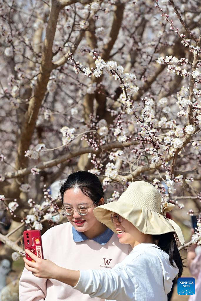People view blooming apricot flowers during a cultural and tourism event held in Yaha Township of Kuqa County, northwest China's Xinjiang Uygur Autonomous Region, March 30, 2024. In recent years, local authorities of Kuqa have vigorously promoted large-scale and standardized apricot planting to increase income for local villagers. (Xinhua/Ding Lei)