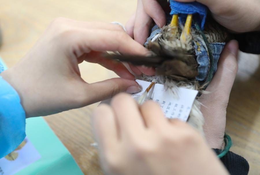 Meng Die splices feathers for an injured sparrow hawk at Shenyang Raptor Rescue Center in Shenyang, northeast China's Liaoning Province, March 23, 2024. (Xinhua/Yang Qing)