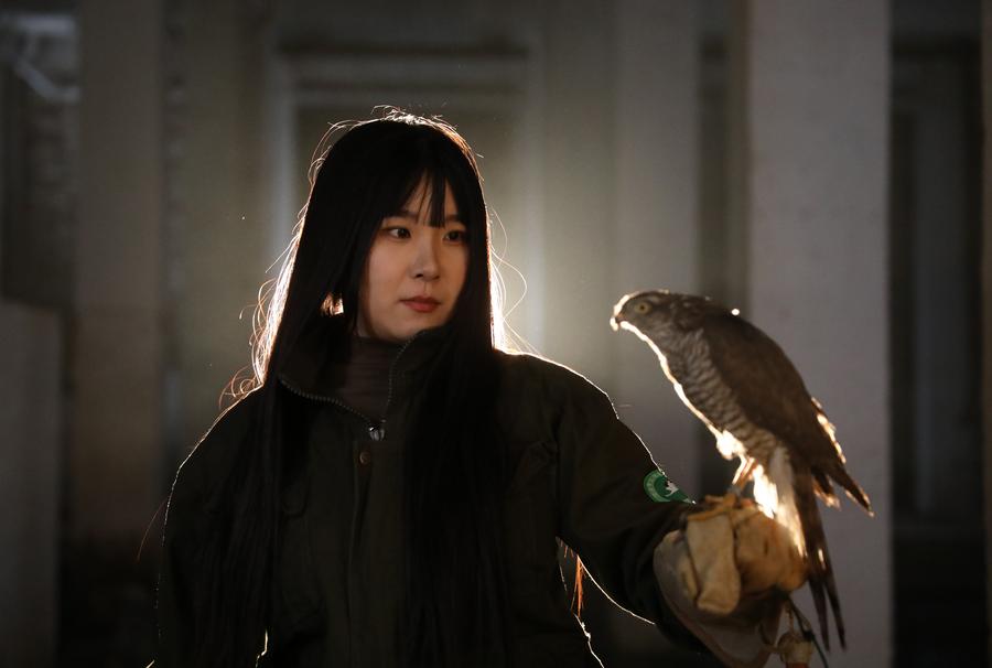 Meng Die poses for a photo with a sparrow hawk she rescued at Shenyang Raptor Rescue Center in Shenyang, northeast China's Liaoning Province, March 23, 2024. (Xinhua/Yang Qing)