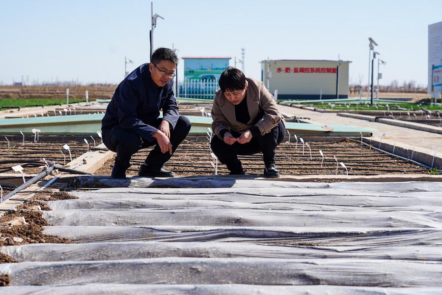 Staff members check the growth of saline-alkali tolerance crops in the Agricultural High-tech Industrial Demonstration Area of the Yellow River Delta in Dongying, east China's Shandong Province, March 19, 2024. (Xinhua/Zhu Zheng)