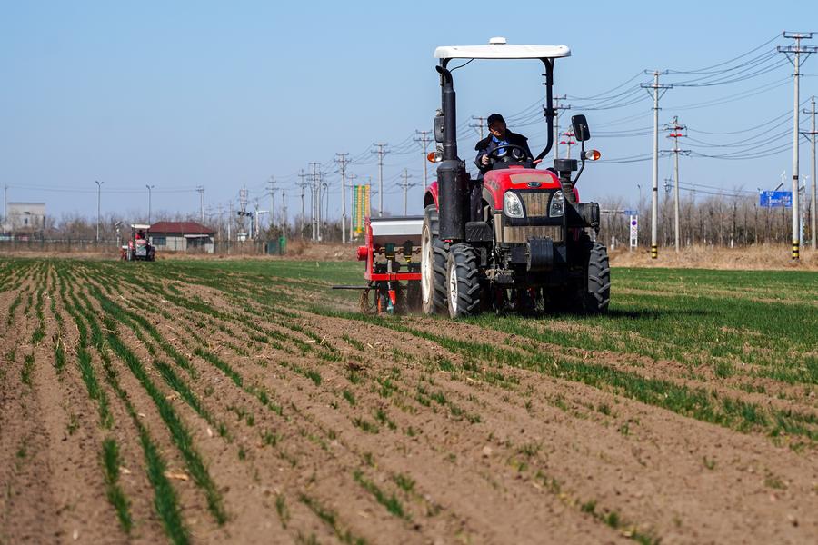 Staff members operate agricultural machinery to fertilize saline-alkali tolerance wheat in the Agricultural High-tech Industrial Demonstration Area of the Yellow River Delta in Dongying, east China's Shandong Province, March 19, 2024. (Xinhua/Zhu Zheng)