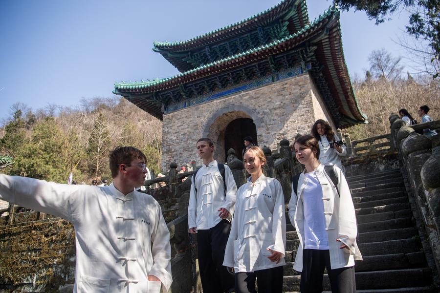 Members of a delegation of high school students from the U.S. state of Washington visit Wudang Mountain, a sanctuary for the Taoism martial art, in central China's Hubei Province, March 22, 2024. (Xinhua/Wu Zhizun)