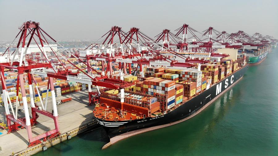 A drone photo shows a cargo ship docking at Qingdao Port in east China's Shandong Province, March 13, 2024. (Xinhua/Li Ziheng)