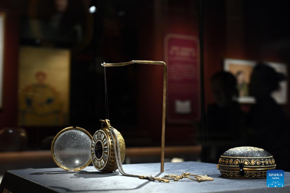 A pocket watch is displayed during an exhibition at the Palace Museum in Beijing, capital of China, April 1, 2024. The exhibition "The Forbidden City and the Palace of Versailles: Exchanges Between China and France in the 17th and 18th Centuries" opened at the Palace Museum in Beijing on Monday, showcasing about 200 cultural relics. (Xinhua/Jin Liangkuai)