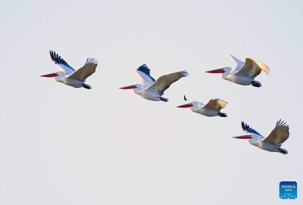 The Dalmatian pelicans fly over the Urad Grassland in north China's Inner Mongolia Autonomous Region, April 1, 2024. (Xinhua/Li Yunping)