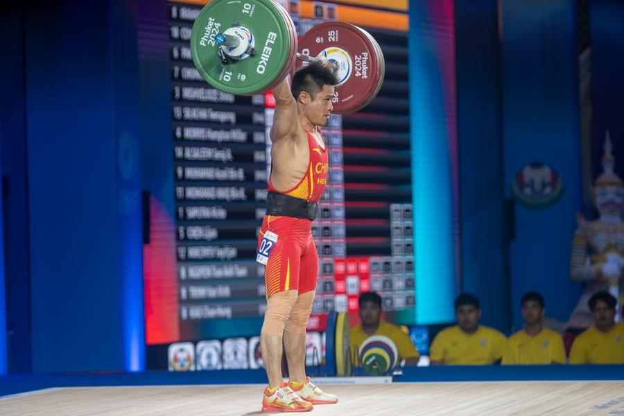 Li Fabin in action during the men's 61kg competition at the IWF World Cup in Phuket, Thailand, April 2, 2024. (Xinhua/Lin Hao)