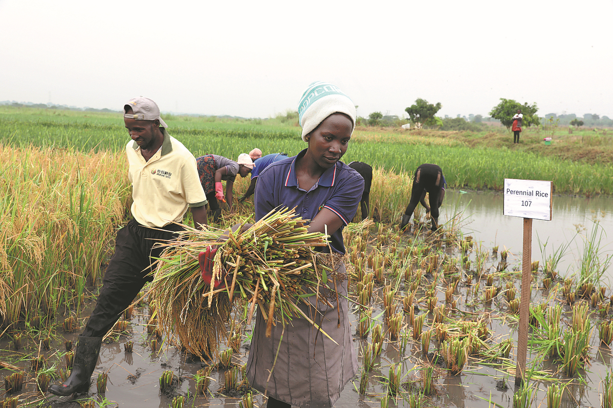Perennial rice Yunda 107 is harvested from a test field in Luwero, Uganda. WU XIAOHUI/CHINA DAILY