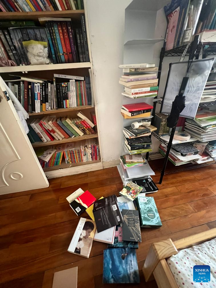 Fallen books are pictured at a resident's home in Gulou District in Fuzhou, southeast China's Fujian Province, April 3, 2024. A 7.3-magnitude earthquake jolted the sea area near Hualien of China's Taiwan at 7:58 a.m. Wednesday (Beijing Time), according to the China Earthquake Networks Center (CENC). The epicenter was monitored at 23.81 degrees north latitude and 121.74 degrees east longitude, at a depth of 12 km, said a report issued by the CENC. Strong tremors were felt in Fuzhou. (Photo by Wang Yi/Xinhua)