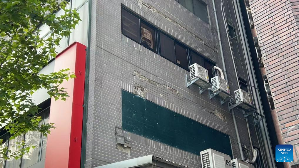 This photo taken on April 3, 2024 shows a damaged building in Taipei, southeast China's Taiwan. A 7.3-magnitude earthquake jolted the sea area near Hualien of China's Taiwan at 7:58 a.m. Wednesday (Beijing Time), according to the China Earthquake Networks Center (CENC). The epicenter was monitored at 23.81 degrees north latitude and 121.74 degrees east longitude, at a depth of 12 km, said a report issued by the CENC. (Xinhua/Qi Fei)