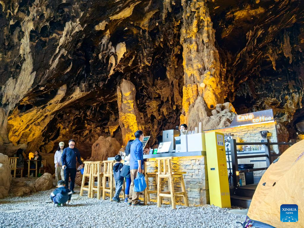 Tourists order coffee at the bar of a cave-themed caf in Fumin County of Kunming, southwest China's Yunnan Province, March 16, 2024. (Xinhua/Ji Zhepeng)
