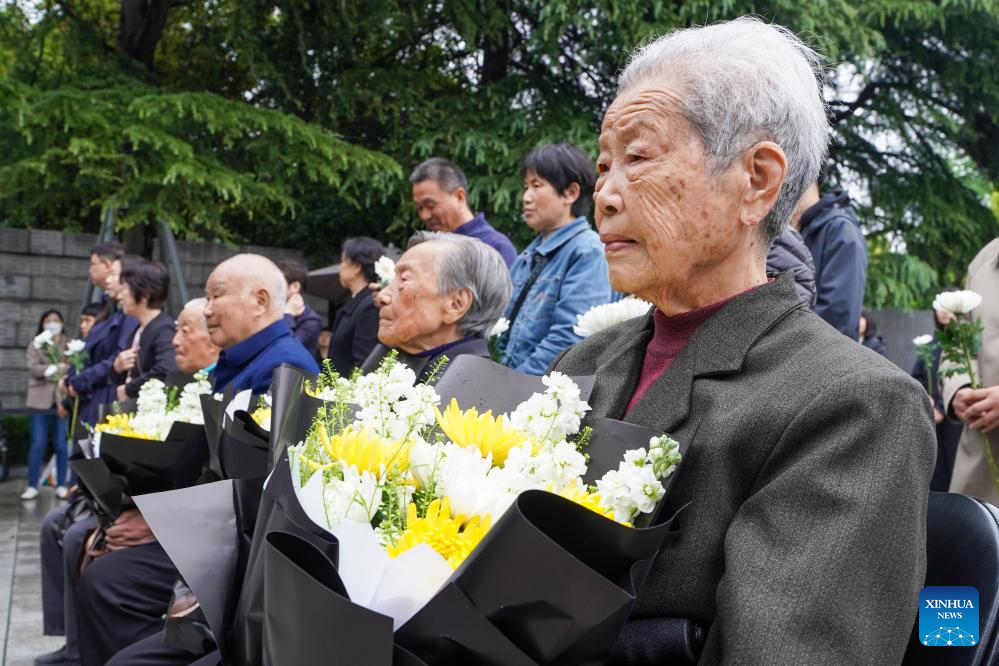 NANJING, April 3 (Xinhua) -- Relatives of victims of the Nanjing Massacre, as well as survivors, the descendants of survivors and student representatives, on Wednesday gathered at the Memorial Hall of the Victims in Nanjing Massacre by Japanese Invaders to pay tribute to those who lost their lives 87 years ago.