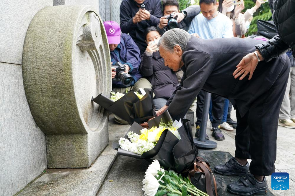 Xia Shuqin, a survivor of the Nanjing Massacre, lays flowers to victims of the Nanjing Massacre at the Memorial Hall of the Victims in Nanjing Massacre by Japanese Invaders, in Nanjing, east China's Jiangsu Province, April 3, 2024.