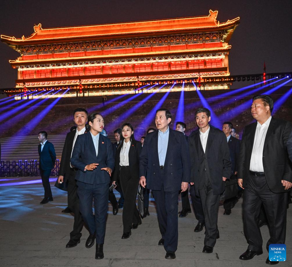 Ma Ying-jeou, former chairman of the Chinese Kuomintang party, visits the Yongning Gate of the ancient city wall in Xi'an, northwest China's Shaanxi Province, April 5, 2024. A delegation of young people from Taiwan led by Ma visited the ancient city wall scenic spot in Xi'an on Friday. (Xinhua/Chen Yehua)