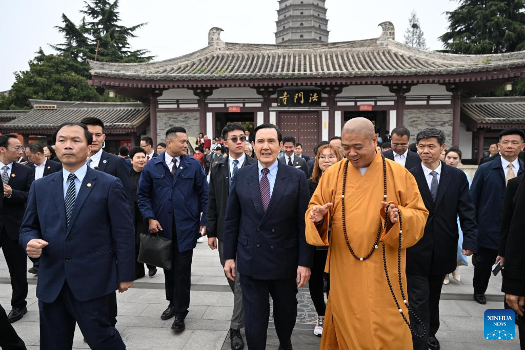 Ma Ying-jeou, former chairman of the Chinese Kuomintang party, and members of a delegation of young people from Taiwan visit Famen Temple in Famen Town of Fufeng County in Baoji City, northwest China's Shaanxi Province, April 5, 2024. A delegation of young people from Taiwan led by Ma visited Famen Temple on Friday. (Xinhua/Chen Yehua)