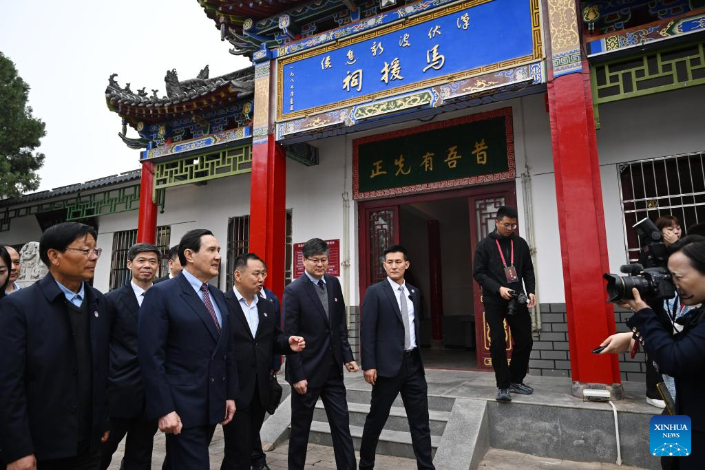 Ma Ying-jeou, former chairman of the Chinese Kuomintang party, and members of a delegation of young people from Taiwan visit the Ancestral Hall of Ma Yuan at the Yangling demonstration zone in northwest China's Shaanxi Province, April 5, 2024. A delegation of young people from Taiwan led by Ma visited the Ancestral Hall and the tomb of Ma Yuan on Friday. (Xinhua/Chen Yehua)