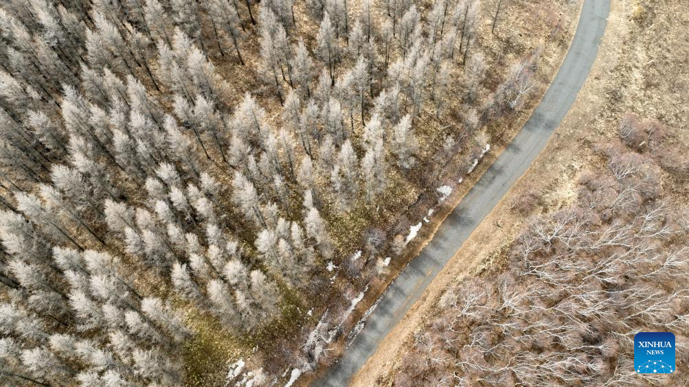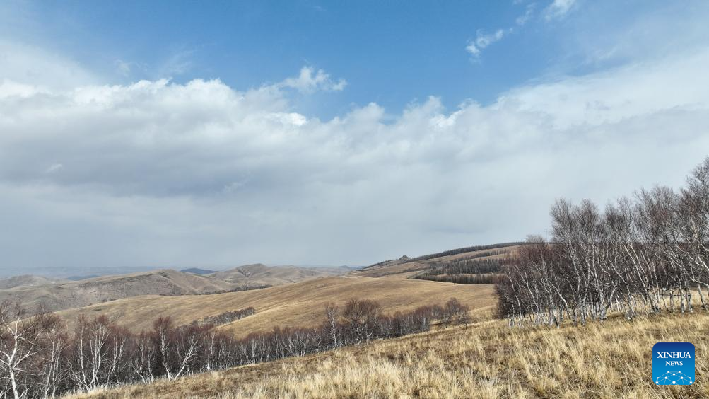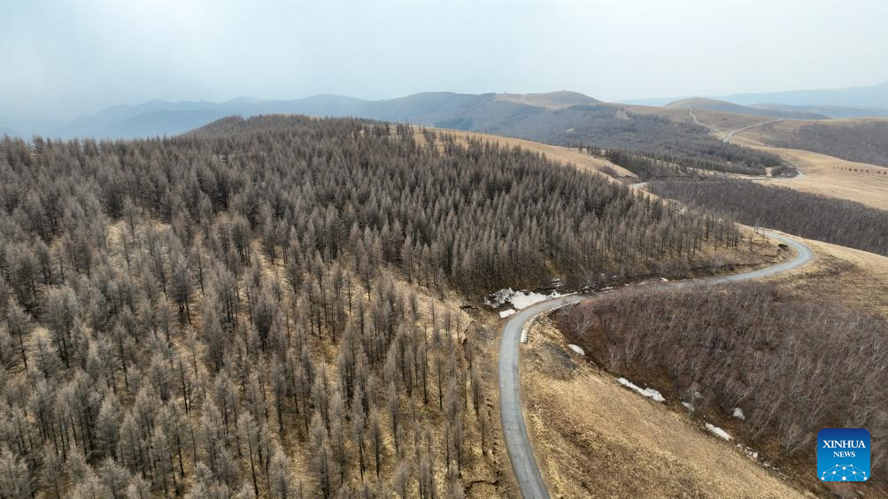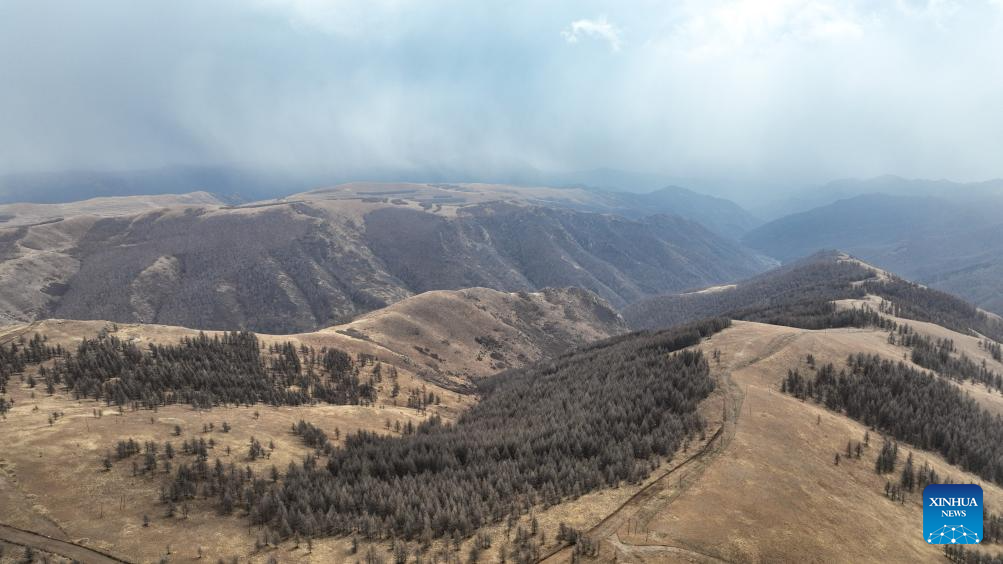 An aerial drone photo taken on April 4, 2024 shows a view of Daqingshan Nature Reserve in Hohhot, north China's Inner Mongolia Autonomous Region. (Xinhua/Bei He)