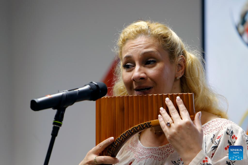 Georgiana Pana, a pan flute player, performs during a "7 Days in China" lecture at the China Cultural Center in Bucharest, Romania, April 4, 2024. The China Cultural Center in Bucharest hosted a "7 Days in China" lecture on Thursday as part of the "China Stories" series. Four Romanian artists shared their journeys to China, offering perspectives on contemporary China.(Photo by Cristian Cristel/Xinhua)