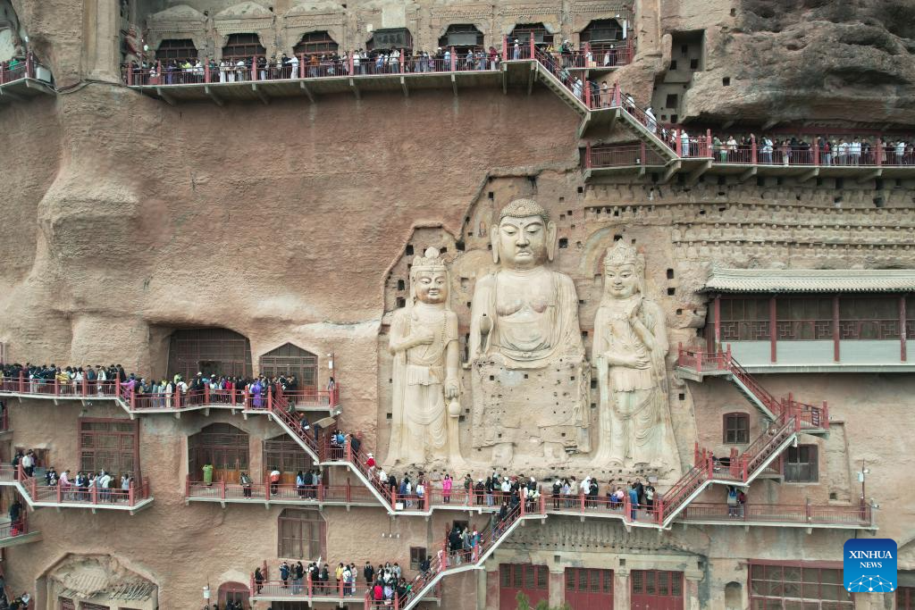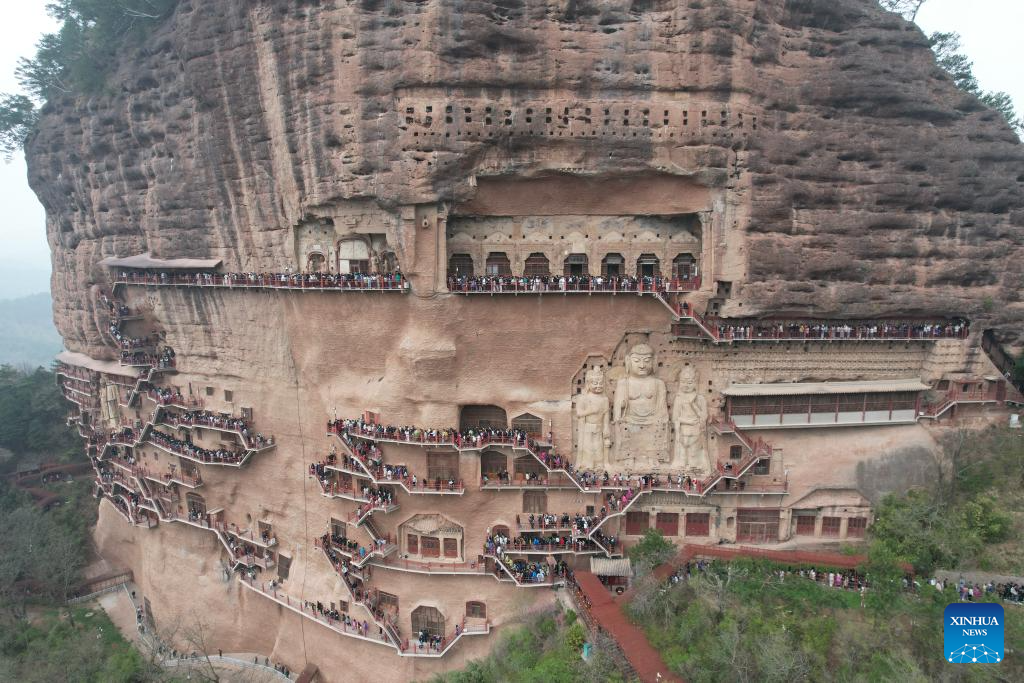 A drone photo taken on April 5, 2024 shows tourists visiting the Maiji Mountain Grottoes in Maiji District of Tianshui City, northwest China's Gansu Province. Tianshui has garnered considerable attention in the cyber world thanks to the popularity of Tianshui's malatang, a numbing-spicy hotpot. When it comes to the real world, the city received 309,000 and 348,600 tourists on April 4 and 5, the first two day of the three-day Qingming holiday, with tourism-related revenue of 177 million yuan (about 24.47 million U.S. dollars) and 198 million yuan (about 27.37 million U.S. dollars), respectively. (Xinhua/Zhang Zhimin)
