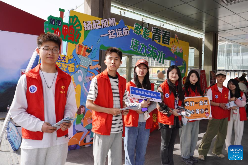 Volunteers greet tourists at Tianshui South Railway Station in Tianshui City, northwest China's Gansu Province, April 3, 2024. Tianshui has garnered considerable attention in the cyber world thanks to the popularity of Tianshui's malatang, a numbing-spicy hotpot. When it comes to the real world, the city received 309,000 and 348,600 tourists on April 4 and 5, the first two day of the three-day Qingming holiday, with tourism-related revenue of 177 million yuan (about 24.47 million U.S. dollars) and 198 million yuan (about 27.37 million U.S. dollars), respectively. (Xinhua/Ma Xiping)