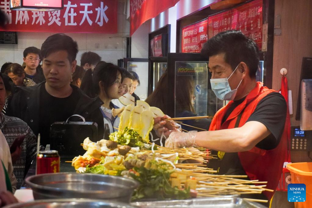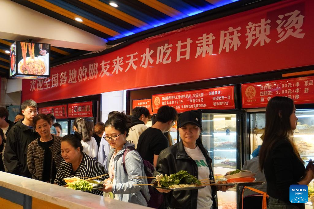 Customers are pictured in a store serving malatang in Maiji District of Tianshui City, northwest China's Gansu Province, April 3, 2024. Tianshui has garnered considerable attention in the cyber world thanks to the popularity of Tianshui's malatang, a numbing-spicy hotpot. When it comes to the real world, the city received 309,000 and 348,600 tourists on April 4 and 5, the first two day of the three-day Qingming holiday, with tourism-related revenue of 177 million yuan (about 24.47 million U.S. dollars) and 198 million yuan (about 27.37 million U.S. dollars), respectively. (Xinhua/Ma Xiping)
