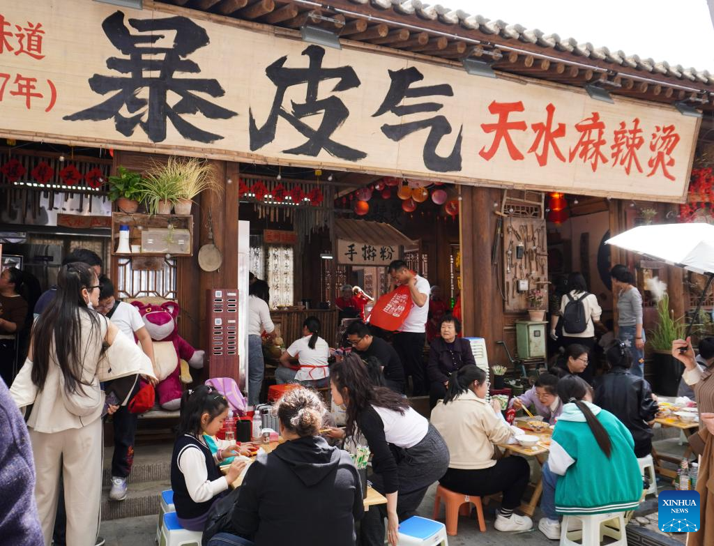 Customers enjoy malatang at a store in Qinzhou District of Tianshui City, northwest China's Gansu Province, April 4, 2024. Tianshui has garnered considerable attention in the cyber world thanks to the popularity of Tianshui's malatang, a numbing-spicy hotpot. When it comes to the real world, the city received 309,000 and 348,600 tourists on April 4 and 5, the first two day of the three-day Qingming holiday, with tourism-related revenue of 177 million yuan (about 24.47 million U.S. dollars) and 198 million yuan (about 27.37 million U.S. dollars), respectively. (Xinhua/Ma Xiping)