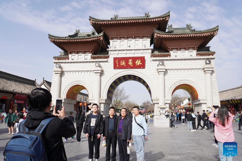 Tourists pose for photos at Fuxi Temple scenic area in Qinzhou District of Tianshui City, northwest China's Gansu Province, April 4, 2024. Tianshui has garnered considerable attention in the cyber world thanks to the popularity of Tianshui's malatang, a numbing-spicy hotpot. When it comes to the real world, the city received 309,000 and 348,600 tourists on April 4 and 5, the first two day of the three-day Qingming holiday, with tourism-related revenue of 177 million yuan (about 24.47 million U.S. dollars) and 198 million yuan (about 27.37 million U.S. dollars), respectively. (Xinhua/Ma Xiping)