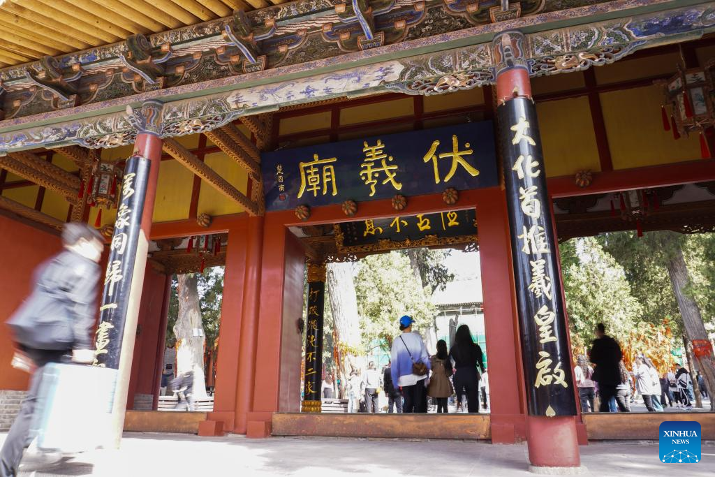 Tourists visit Fuxi Temple scenic area in Qinzhou District of Tianshui City, northwest China's Gansu Province, April 4, 2024. Tianshui has garnered considerable attention in the cyber world thanks to the popularity of Tianshui's malatang, a numbing-spicy hotpot. When it comes to the real world, the city received 309,000 and 348,600 tourists on April 4 and 5, the first two day of the three-day Qingming holiday, with tourism-related revenue of 177 million yuan (about 24.47 million U.S. dollars) and 198 million yuan (about 27.37 million U.S. dollars), respectively. (Xinhua/Ma Xiping)