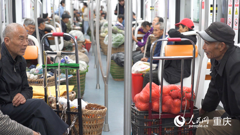 A subway line in southwest China's Chongqing Municipality has dedicated carriages for farmers to transport baskets of vegetables from rural areas to sell downtown.