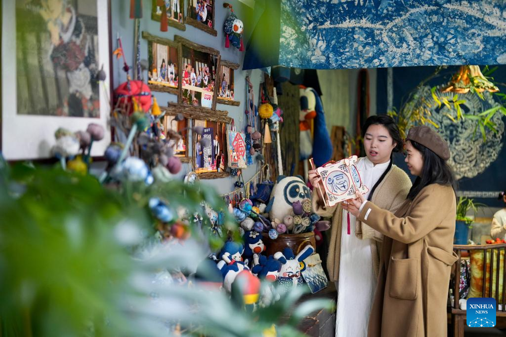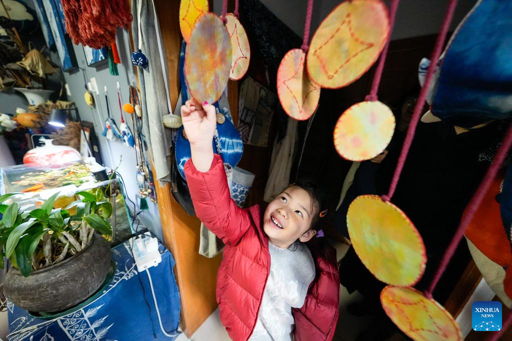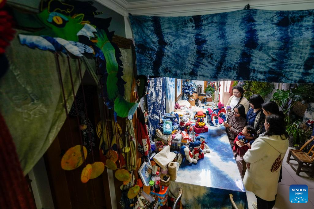 A young learner views batik products at Li Sa's studio in Tangshan, north China's Hebei Province, April 6, 2024.