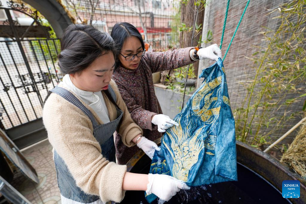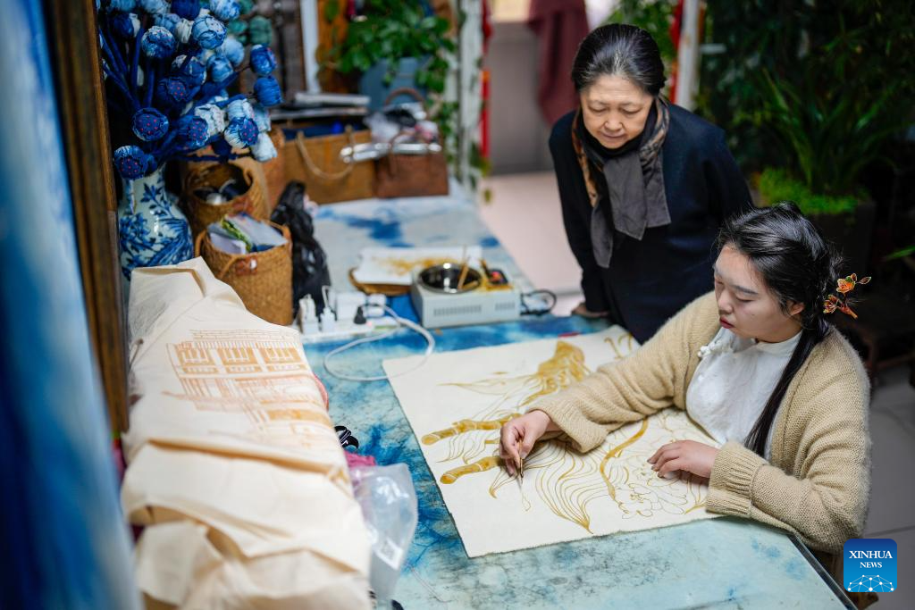 Li Sa (R) demonstrates the batik technique at her studio in Tangshan, north China's Hebei Province, April 6, 2024.