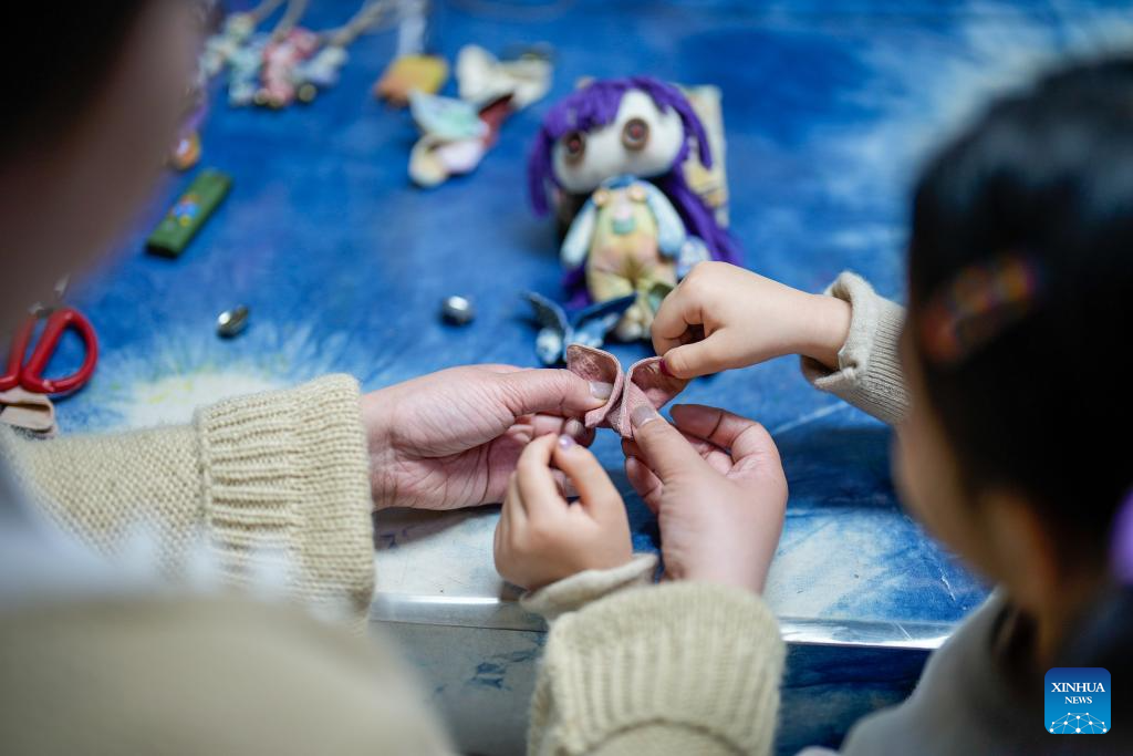 Li Sa (L) teaches a young learner to make batik product at her studio in Tangshan, north China's Hebei Province, April 6, 2024.