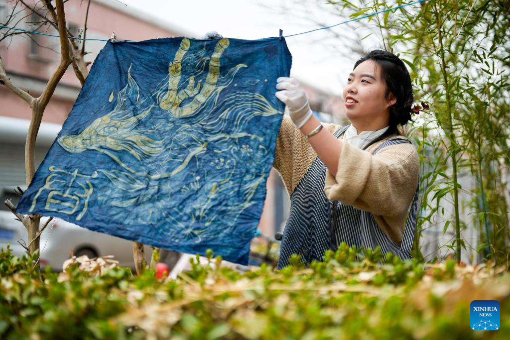 Li Sa smooths out batik cloth in Tangshan, north China's Hebei Province, April 6, 2024.