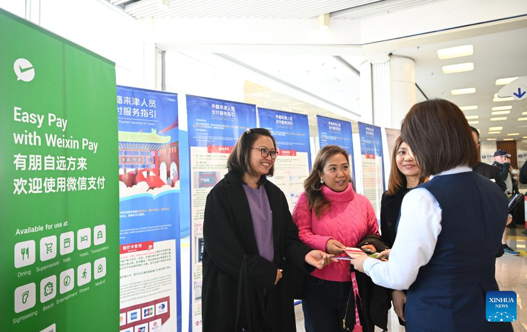 A staff member provides foreign tourists with guide materials about payment methods in north China's Tianjin Municipality on April 7, 2024. (Xinhua/Sun Fanyue)