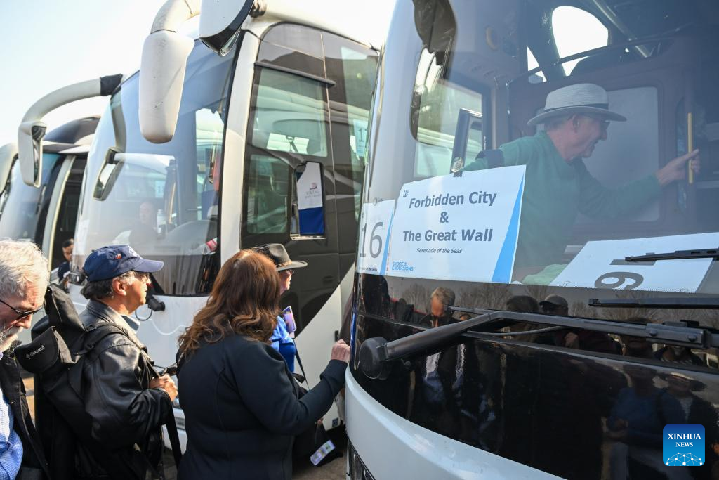 Foreign tourists board a coach at Tianjin International Cruise Home Port in north China's Tianjin Municipality on April 7, 2024. (Xinhua/Sun Fanyue)