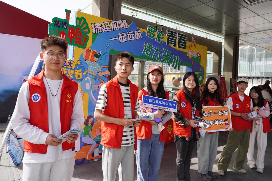 Volunteers greet tourists at Tianshui South Railway Station in Tianshui City, northwest China's Gansu Province, April 3, 2024. (Xinhua/Ma Xiping)