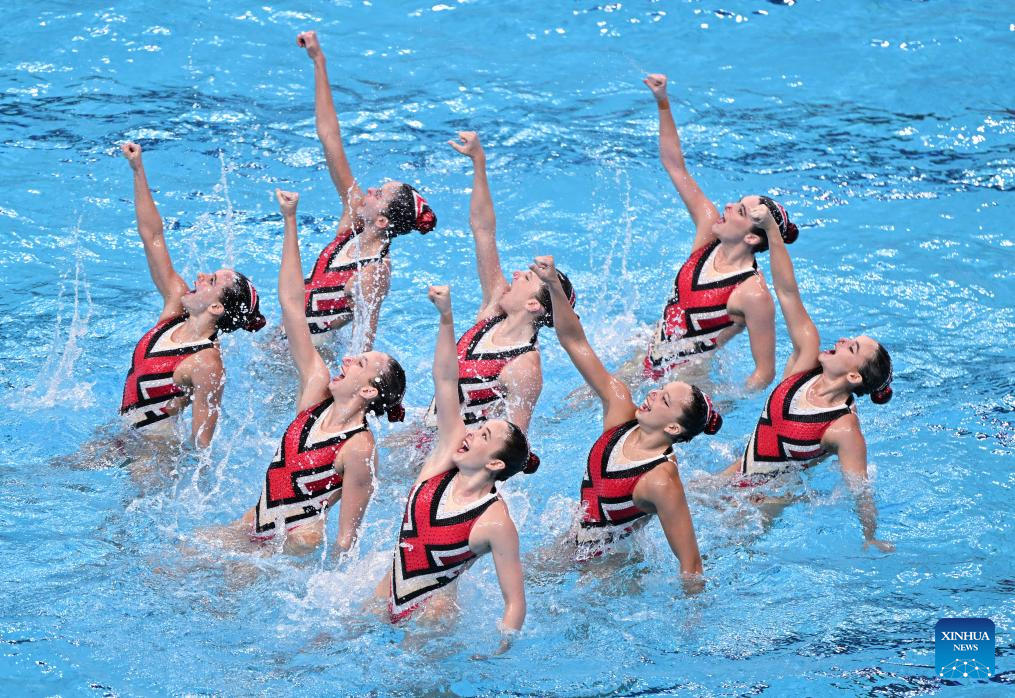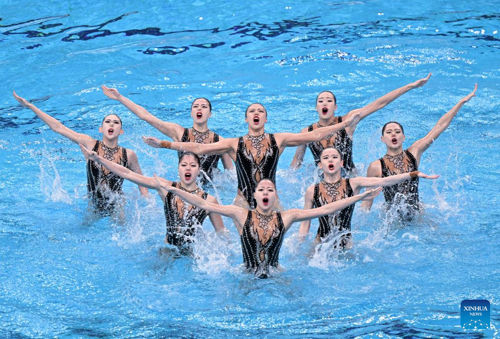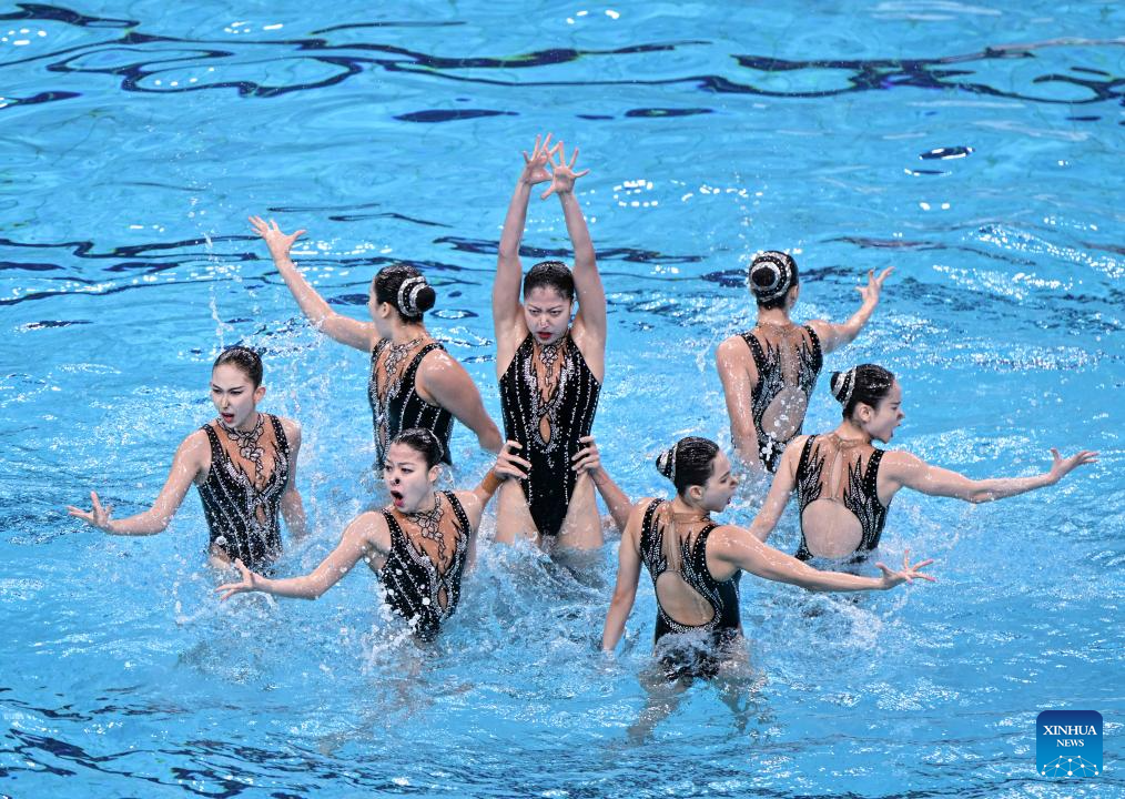 The team of China's Hong Kong compete during the team acrobatic final at World Aquatics Artistic Swimming World Cup 2024 in Beijing, China, April 7, 2024. (Xinhua/Xia Yifang)