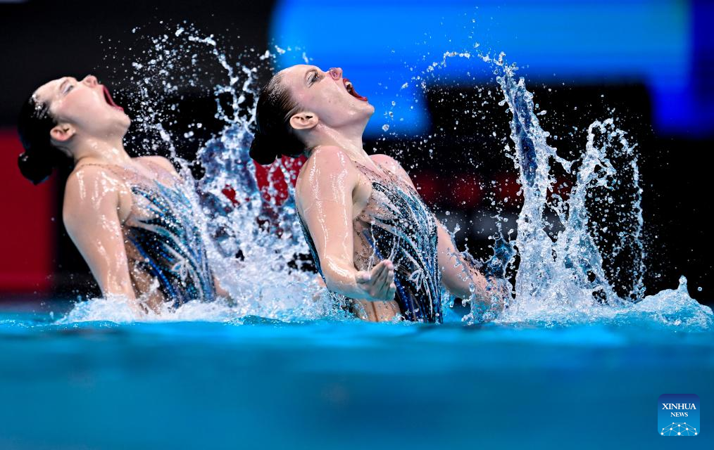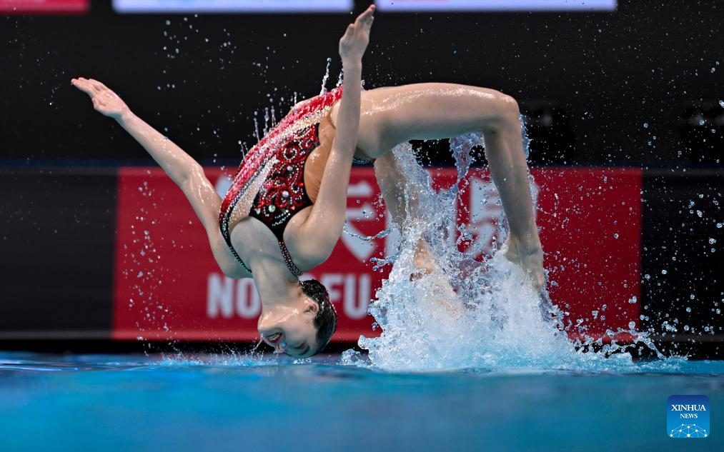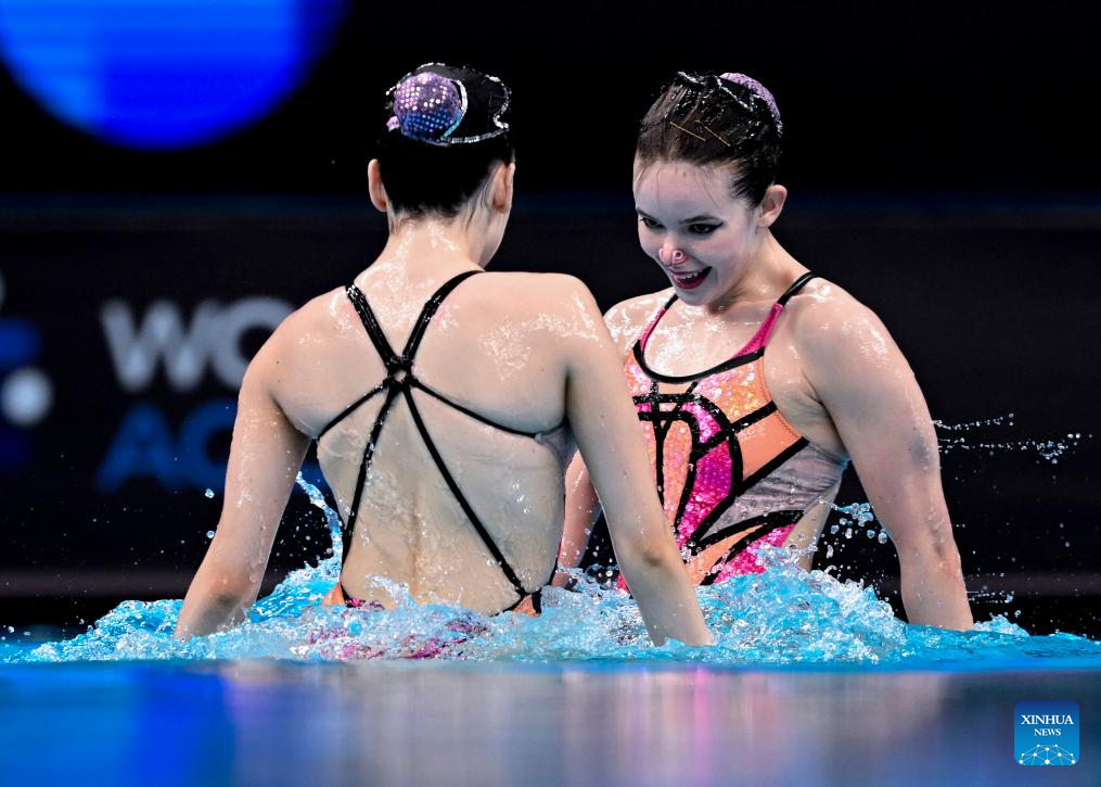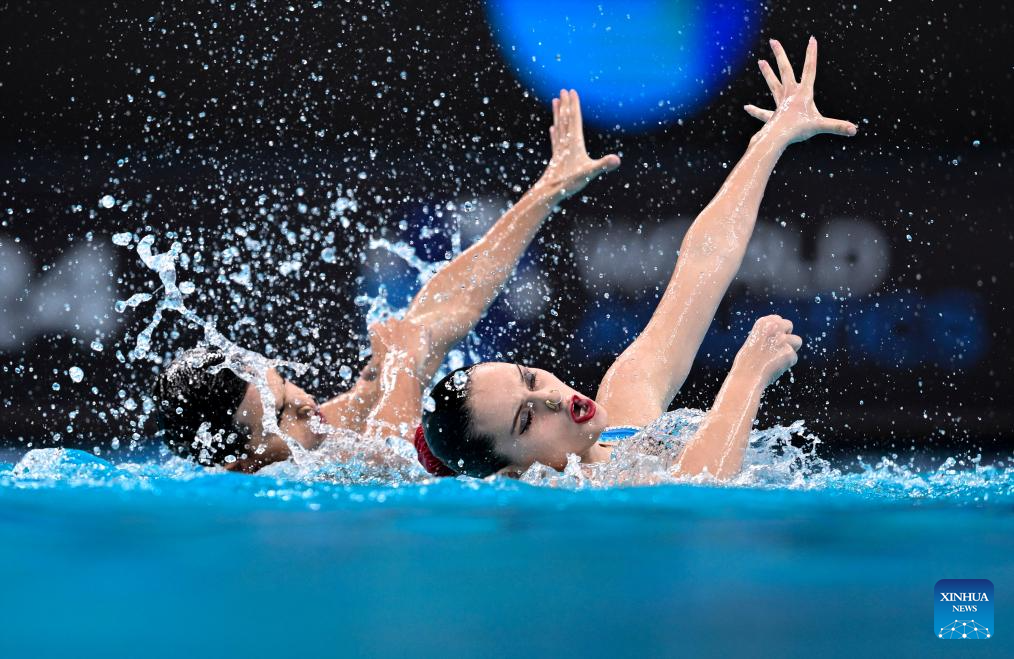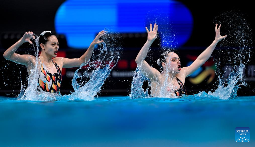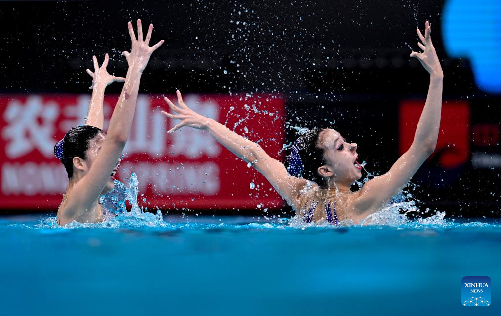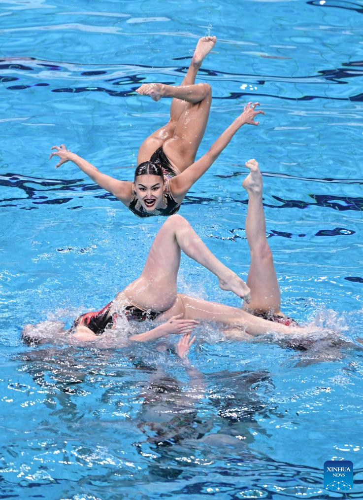 Lin Yanhan/Xu Huiyan (R) of China compete during the women duet free final at the World Aquatics Artistic Swimming World Cup 2024 in Beijing, capital of China, April 7, 2024. (Xinhua/Xia Yifang)