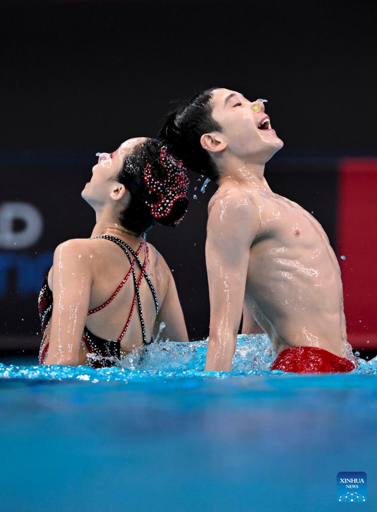 Guo Muxi (R)/Gu Jiayu of China compete during the mixed duet free final at the World Aquatics Artistic Swimming World Cup 2024 in Beijing, capital of China, April 7, 2024. (Xinhua/Xia Yifang)