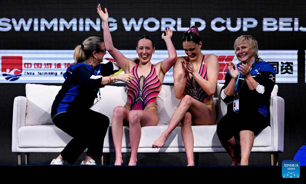 Shelly Bobritsky (2nd L)/Ariel Nassee (2nd R) of Israel react after the women duet free final at the World Aquatics Artistic Swimming World Cup 2024 in Beijing, capital of China, April 7, 2024. (Xinhua/Xia Yifang)