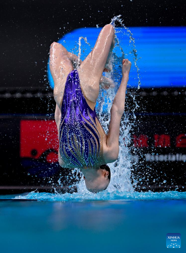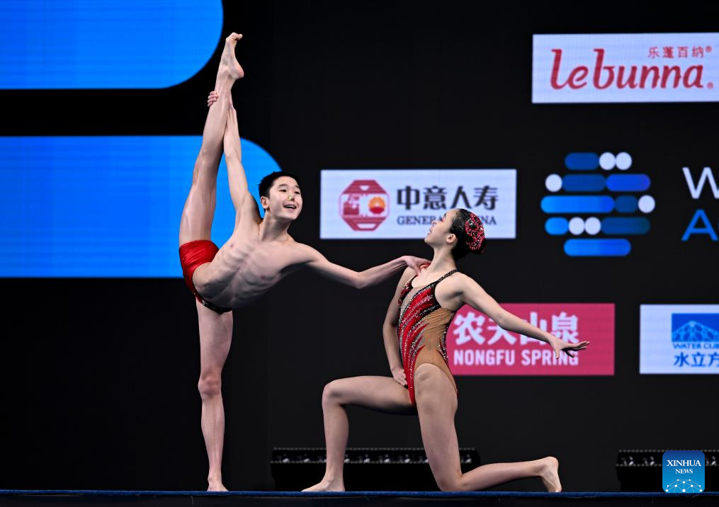 Guo Muxi (not in picture)/Gu Jiayu of China compete during the mixed duet free final at the World Aquatics Artistic Swimming World Cup 2024 in Beijing, capital of China, April 7, 2024. (Xinhua/Xia Yifang)